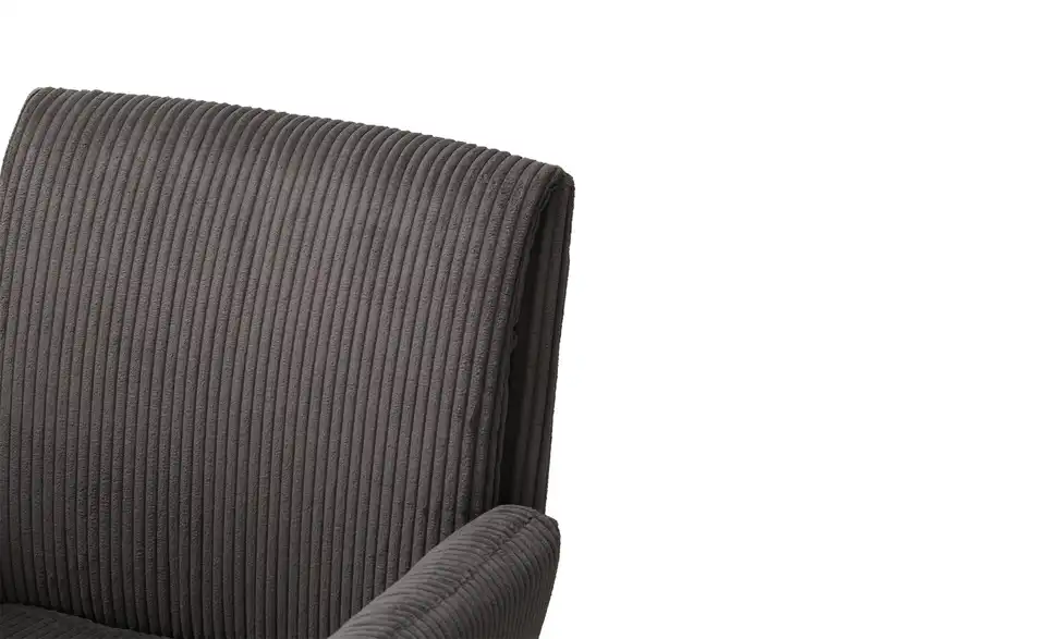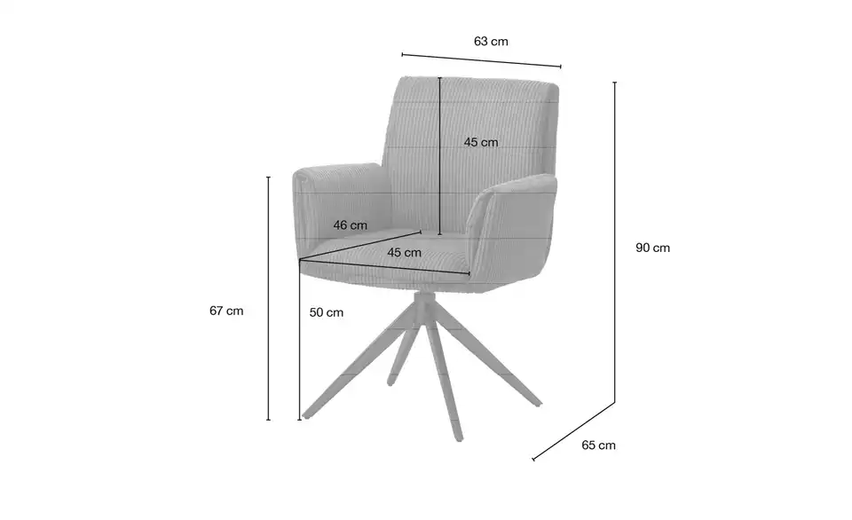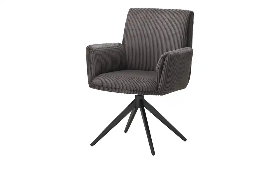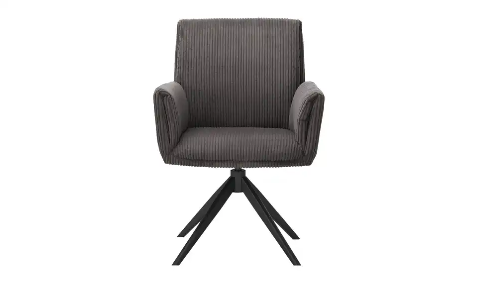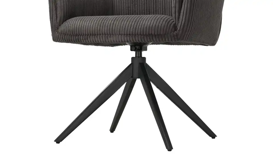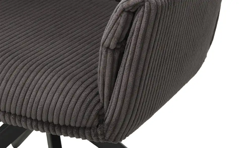 Trendiger Breitcordstoff und ein modernes Metallgestell in Schwarz: Dieser Armlehnstuhl verbindet Design, Funktion und Komfort gekonnt. Der weiche Stoff befindet sich auf der Innenseite der Sitzfläche aber auch auf der Rückseite. So macht der Stuhl aus jeder Perspektive eine gute Figur. Außerdem ist eine praktische Drehfunktion im Stativgestell integriert, die den Stuhl bei Nichtbenutzung sogar in die Ausgangsposition zurückbringt.