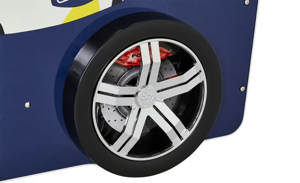 Für kleine Rennfahrer ist das Bettgestell Blue Speed gedacht. Der blaue Flitzer ist richtig mit Reifen ausgestattet �– und Licht hat er natürlich auch. Die Seiten sind mit Flammen, dem Schriftzug „Supreme Energy“ und der Zahl 23 bedruckt. Anstelle des Kopfteils hat der Wagen einen coolen Spoiler. Die Liegefläche ist 90 x 200 Zentimeter groß und kann mit handelsüblichem Lattenrost und Matratze ergänzt werden. Beides finden Sie ebenfalls im Onlineshop.