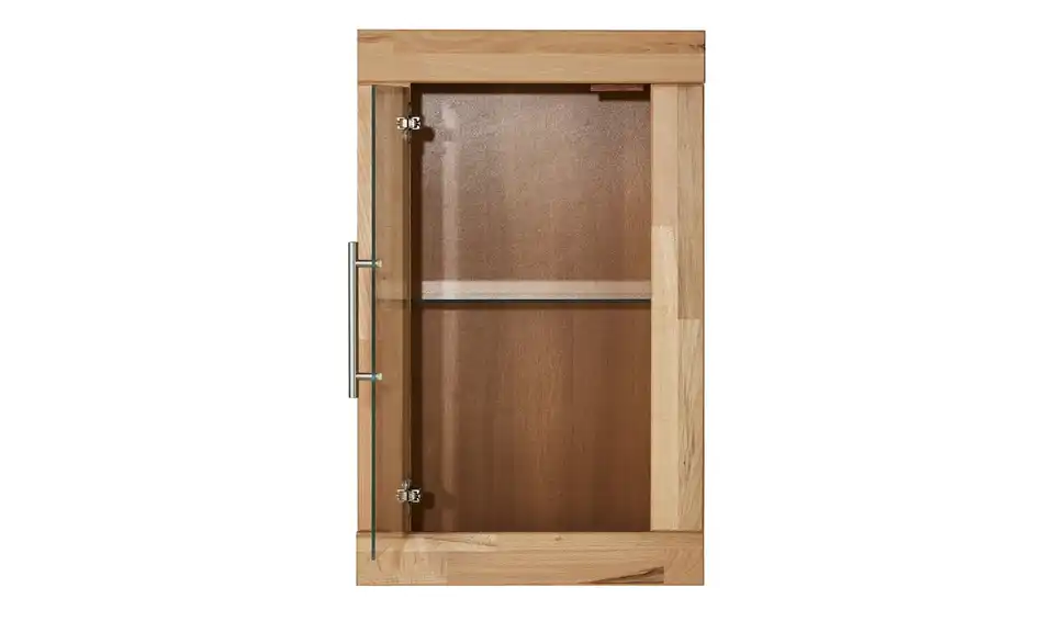 Mit der Serie Oslo zieht natürliches Flair in Ihr Badezimmer. Die Front des Schrankes besteht aus massiver Kernbuche. Die Holzoberfläche ist geölt worden. Der Korpus ist in einem Kernbuchen-Dekor (Nachbildung) gehalten, dass dem Massivholz der Front sehr ähnlich sieht. Kontrastreich zum Holz sind die Glasakzente, denn Tür und Einlegeboden sind aus Klarglas gefertigt. Im Schrankinneren gibt es zwei Fächer für Pflegeprodukte und Kosmetika.