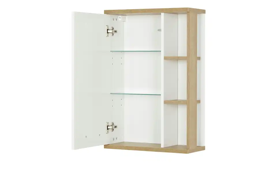 Der Bad-Wandschrank North bietet Stauraum hinter der Drehtür. Die beiden Einlegeböden sind aus Glas und in der Höhe verstellbar. Darüber hinaus hat North seitlich drei offene Fächer. Korpus und Front sind Weiß gehalten und leicht glänzend. Die Absetzungen in Eiche (Nachbildung) stellen einen natürlich anmutenden Kontrast dar.