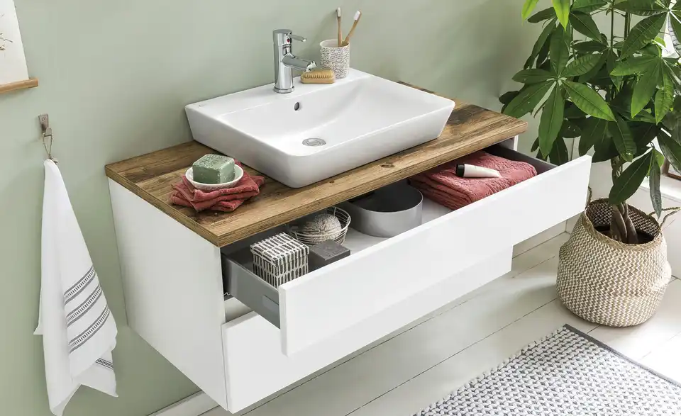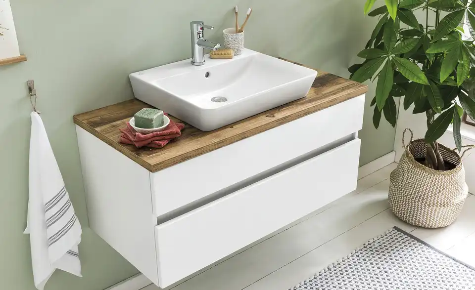 - Bestehend ausWaschtischunterschrank (BTH ca. 100 x 47 x 44 cm)Keramik-Aufsatzwaschtisch (BTH ca. 55 x 46 x 10 cm)Waschtischplatte ohne Ausschnitt (BTH ca. 100 x 49,5 x 2,8 cm)Flächenspiegel (BTH ca. 100 x 4 x 65,6 cm)