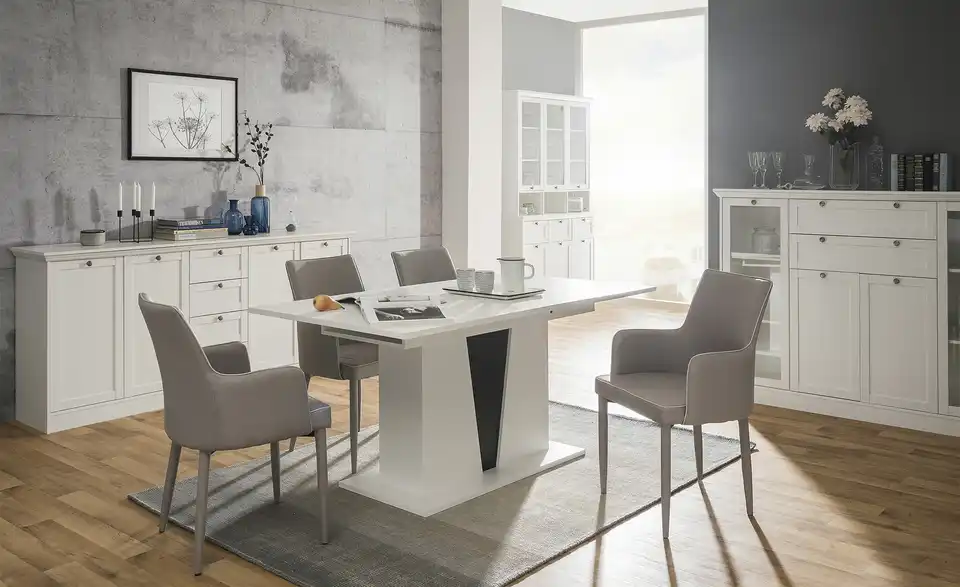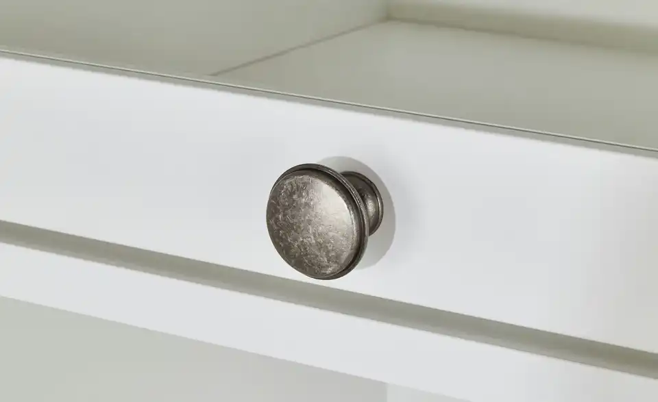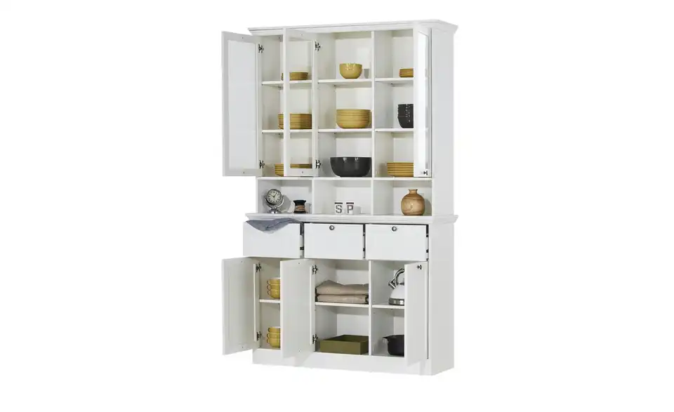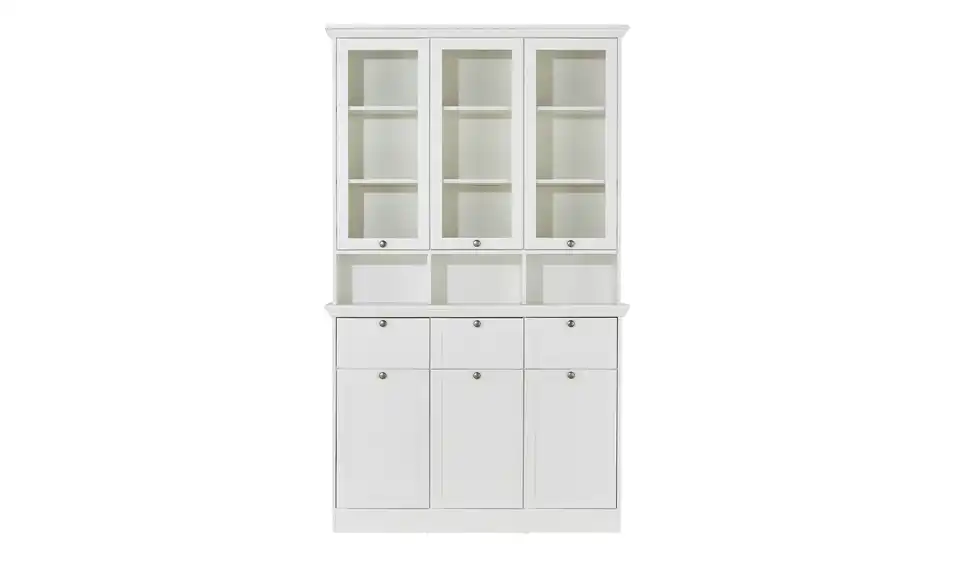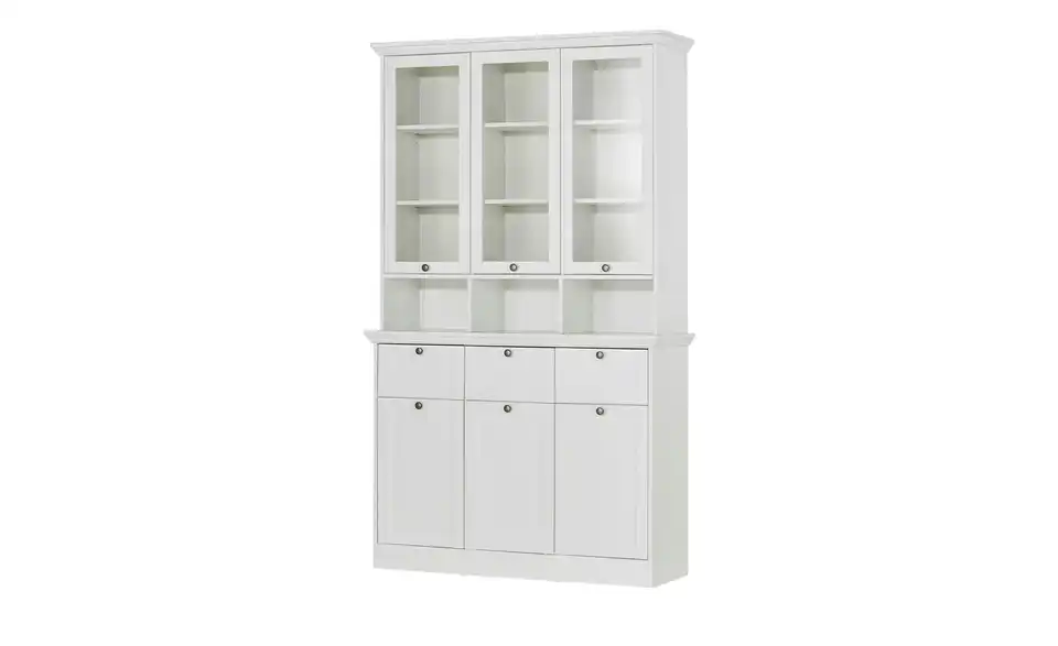 Buffets waren früher typische Möbel für Küchen oder Esszimmer. Heute liegen sie wieder voll im Trend – so wie das Buffet Laurito. Der obere Teil verfügt über drei Türen mit Klarglaseinsatz. Für einen freien Blick in die Fächer dahinter. Hier bietet es sich an, hübsche Tassen, Teller und Co. zu platzieren. Darunter stehen Ihnen drei offene Fächer zur Verfügung. Der untere Buffet-Teil unterteilt sich in drei Schubladen und drei Türen. Viel Platz also, für alles was Sie unterbringen möchten. Korpus und Front sind mit Melamin beschichtet, wodurch die Oberflächen unempfindlich und leicht zu pflegen sind. Der Weißton der Beschichtung ist passend zum Landhausdesign gewählt.