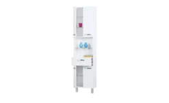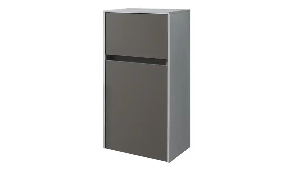 Ganz ohne störende Füße und Griffe kommt das puristisch designte Bad-Highboard Stilaro aus. Der Schrank wird einfach an die Wand montiert. Auf Griffe konnte verzichtet werden. An der Front mittig befindet sich eine Aussparung, in die Sie greifen können. So öffnen Sie Auszug und Tür. Hinter der Tür finden Sie zwei Fächer, getrennt von einem Glasboden. Die Front ist basaltgrau, der Korpus matt und weiß.
