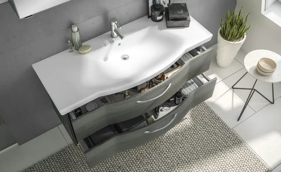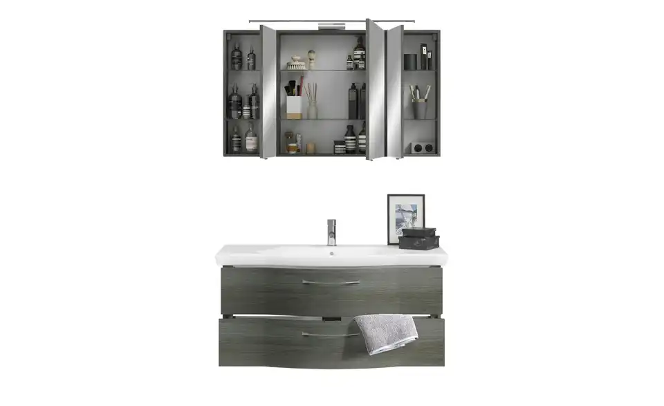Mit der Badezimmerkombination Rovana von calmo bekommt Ihr Bad einen praktischen und dekorativen Mittelpunkt. Zentrales Element ist selbstverständlich der Waschtisch. Er ist aus weißer Keramik gefertigt und hat ein elegant-geschwungenes Design. Passend dazu: der Unterschrank, der die gerundete Front des Waschtisches aufgreift. Der Spiegelschrank ist hingegen geradlinig gestaltet. Rovana hat ein edles Dekor in Graphit Struktur quer (Nachbildung). Den vielseitigen Stauraum können Sie für all die Dinge der täglichen Körperpflege nutzen. In den neun Innenfächern des Spiegelschrankes und in den Auszügen des Unterschrankes ist ausreichend Stauraum zu finden.