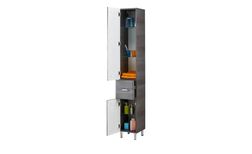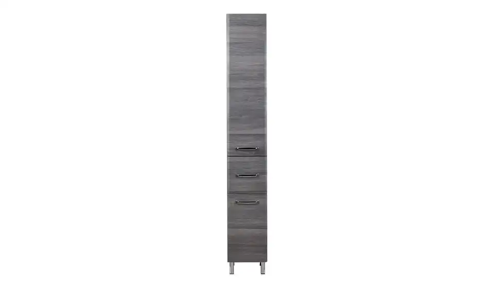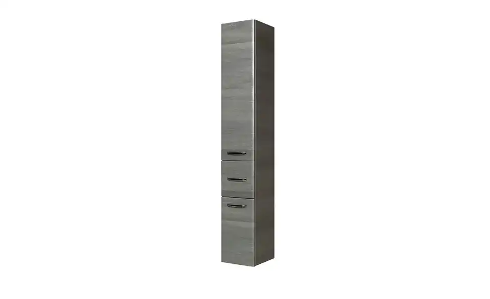 Durch seine hohe, aber schmale Formgebung ist der Bad-Hochschrank Alba optimal für kleinere Bäder. Oben und unten hat er jeweils eine Tür, mittig einen Schubkasten. Hinter den Türen stehen Ihnen drei bzw. zwei Fächer zur Verfügung. Dank seiner strukturierten Graphitoptik ist Alba auch optisch ein Highlight für das Bad.