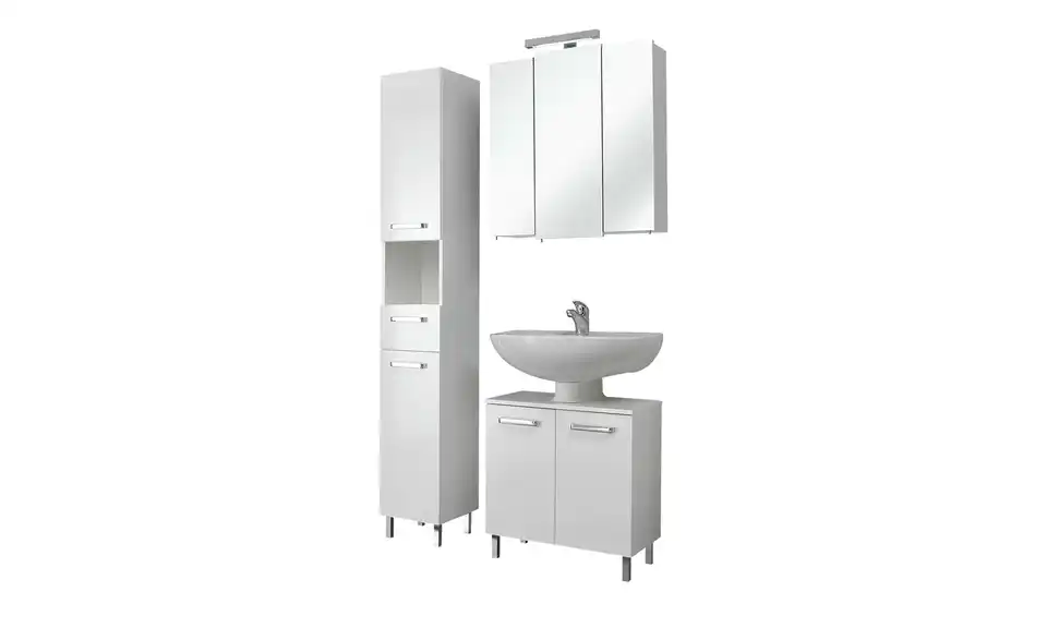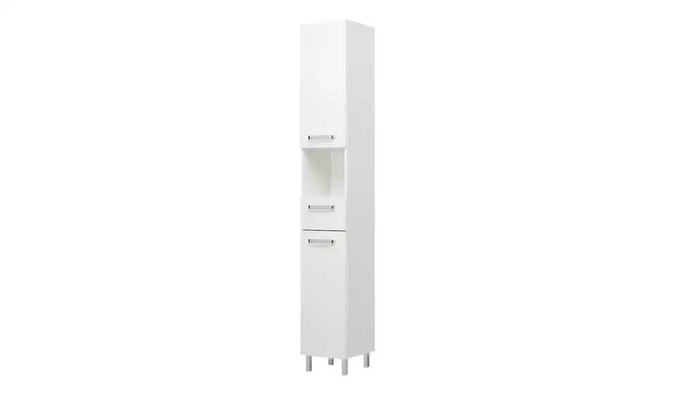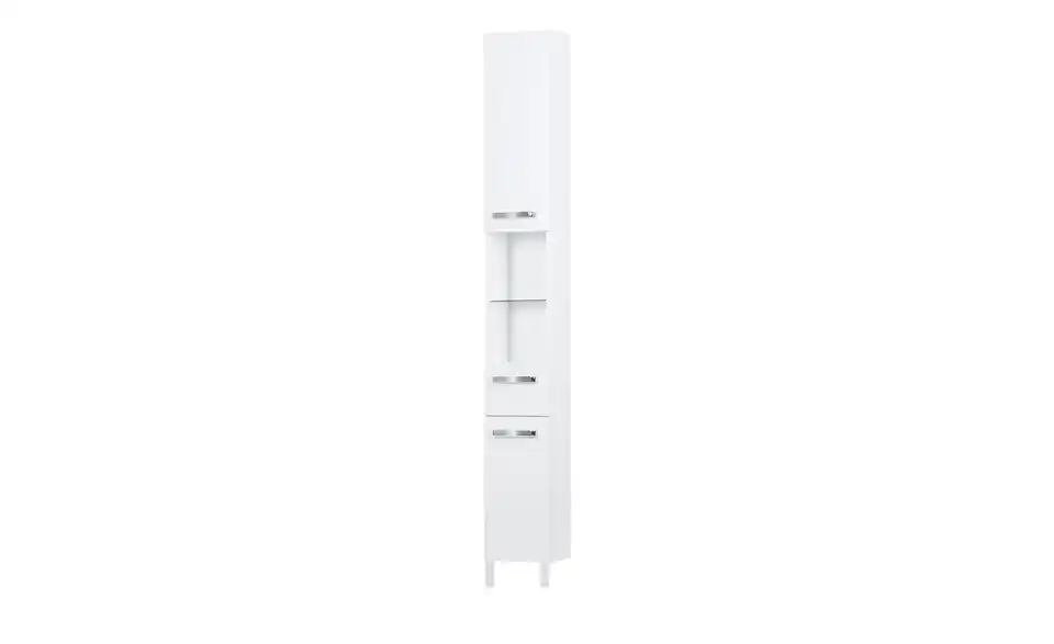 Es gibt jede Menge Dinge, die im Bad immer schnell bei der Hand sein müssen. Im Bad-Hochschrank Wanda finden sie alle einen Platz. Hinter der oberen Tür sind drei Fächer, hinter der unteren Tür zwei Fächer. Darüber hinaus ist Wanda mit zwei offenen Fächern und einer Schublade ausgestattet. Die Einlegeböden sind aus Glas und höhenverstellbar. So können Sie die Größe der Fächer nach Bedarf anpassen. Auch optisch ist Wanda ansprechend. Der Schrank ist schlank designt und komplett weiß. Die Oberfläche hat einen leichten Glanz. Dank der Türdämpfer schließen die Türen geräuscharm.