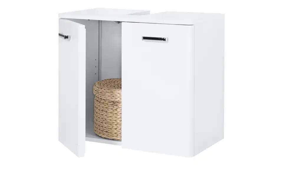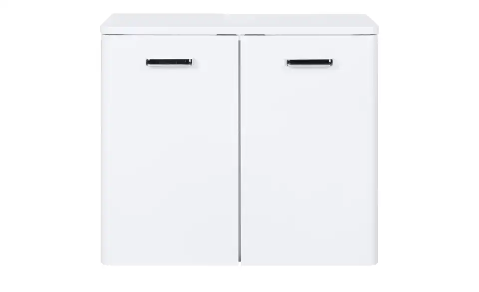 Nutzen Sie den Platz unter Ihrem Waschbecken aus – mit dem Waschbeckenunterschrank Pina. Er bietet Ihnen Staumöglichkeiten hinter den beiden Drehtüren. Die Abdeckplatte oben hat einen Syphonausschnitt. So stört das Abflussrohr des Waschbeckens nicht. Pina ist elegant designt und hat ein stilvolles Weiß. Der Farbton wird durch die Hochglanzoptik in Szene gesetzt. Für weitere Akzente sorgen die Bügelgriffe in Chromoptik.