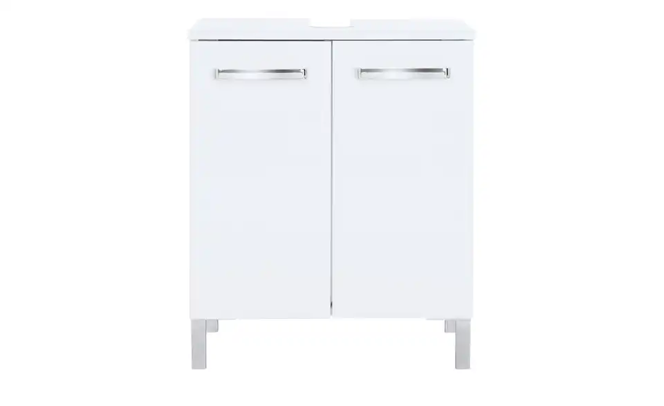 Nutzen Sie den Platz unterhalb des Waschbeckens optimal aus – mit dem Waschbeckenunterschrank Wanda. Er ist mit einem Ausschnitt für das Abflussrohr ausgestattet, damit dieses nicht stört. Hinter den beiden Drehtüren befindet sich ein großer Stauraum. Ideal für Hygieneartikel, Waschmittel und alles, was Sie im Bad brauchen. Die Türen schließen dank des Dämpfers leise. Wanda ist komplett in Weiß gehalten und glänzt leicht. Die verchromten Füße und Griffe setzen Akzente.
