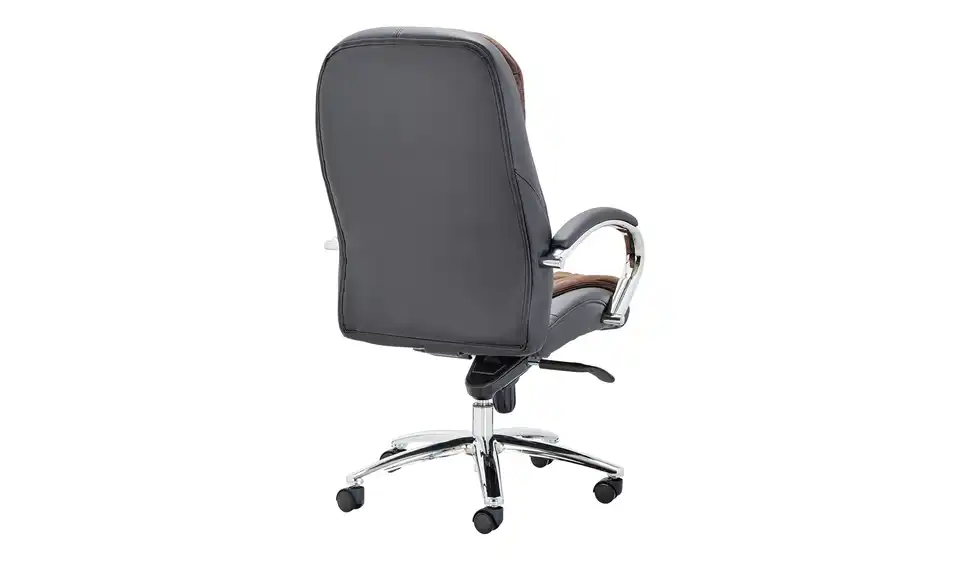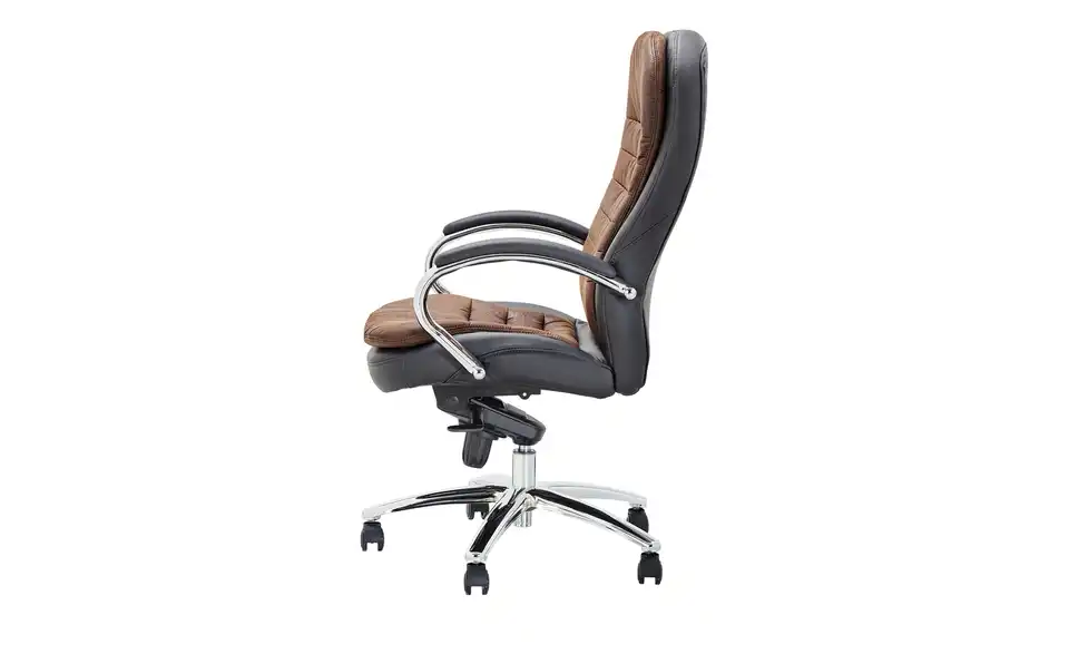 Mit dem Bürostuhl Brend sitzen Sie bequem und können sich ganz der Arbeit widmen. Für eine optimale Körperhaltung können Sie die Sitzhöhe manuell und stufenlos einstellen. Brend ist mit verchromten Armlehnen ausgestattet, die weich gepolstert sind. Der Bezug besteht aus pflegeleichtem Kunstleder in Schwarz und bronzefarbener Microfaser. Das Fußgestell ist verchromt, wodurch der klassische Stuhl eine moderne Note bekommt.
