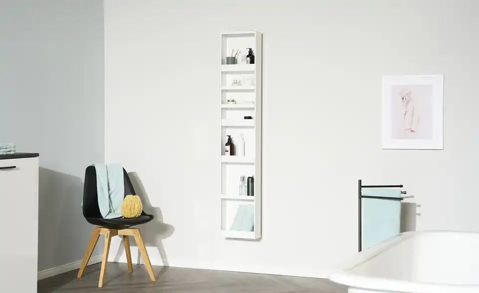 Der Drehspiegelschrank Walensee punktet mit seiner besonderen Größe. Er wird nicht oberhalb eines Waschtisches platziert – sondern separat. Durch seine Höhe bietet er Ihnen eine besonders große Spiegelfläche, die so perfekt fürs Styling ist. Auf der Rückseite verfügt Walensee über sieben praktische Fächer, die sich für Kosmetika und Pflegeprodukte eignen. Um an die Fächer zu gelangen, brauchen Sie den Schrank einfach nur zu drehen.