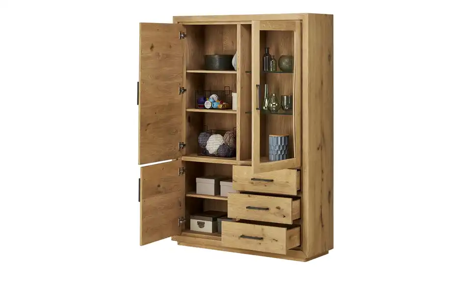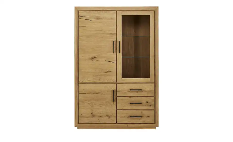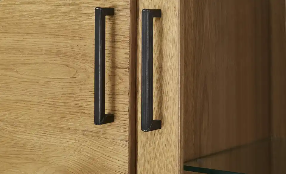 Vielseitigen Stauraum, den bietet die Vitrine Black Coast One von Gray & Jones. Sie verfügt über drei Türen und drei Schubladen. Eine der Türen hat einen Glaseinsatz, durch den Sie in die drei Vitrinenfächer sehen können. Die beiden Böden sind ebenfalls aus Glas gefertigt. Hier ist der ideale Ort, um Geschirr oder Lieblingsstücke zu präsentieren. Black Coast One ist mit Eiche furniert, für den Sockel ist massives Eichenholz verwendet worden. Zum Schutz ist die Holzoberfläche lackiert worden.