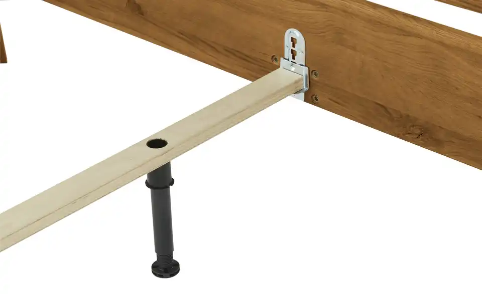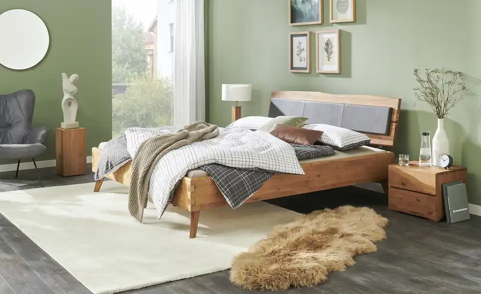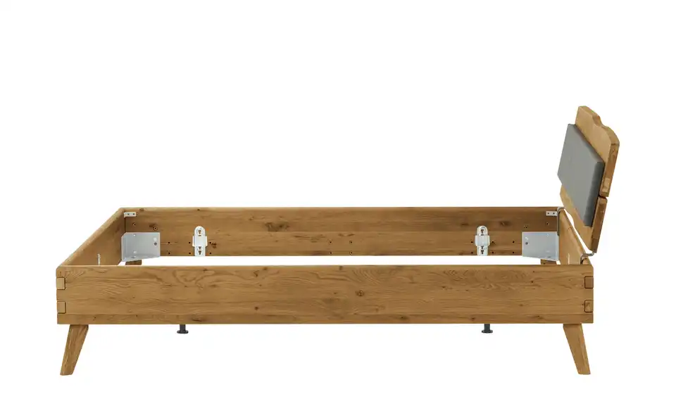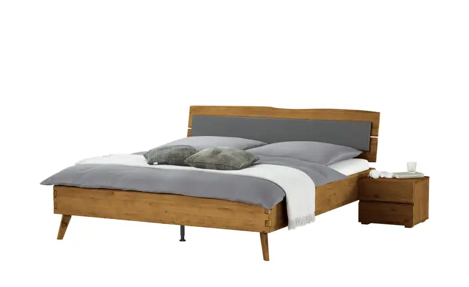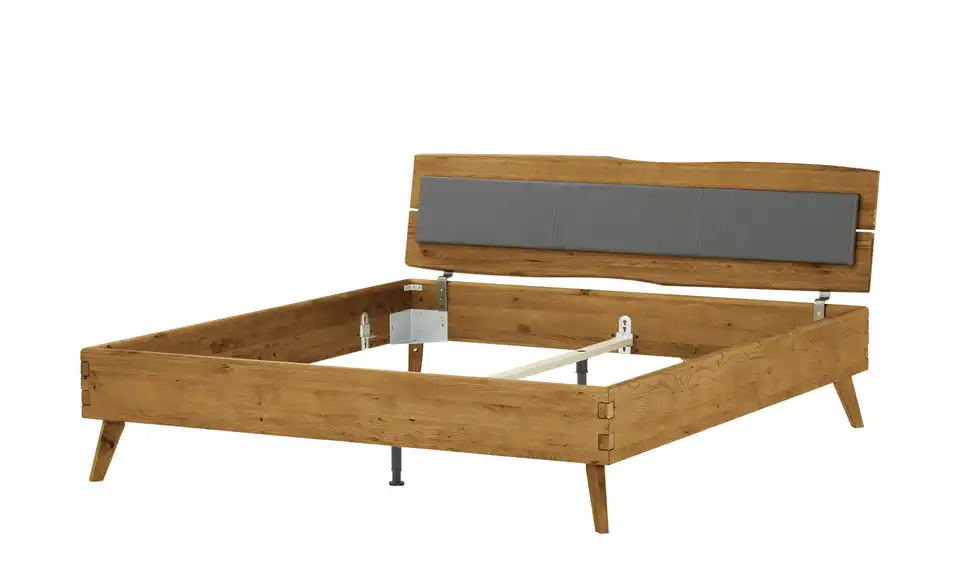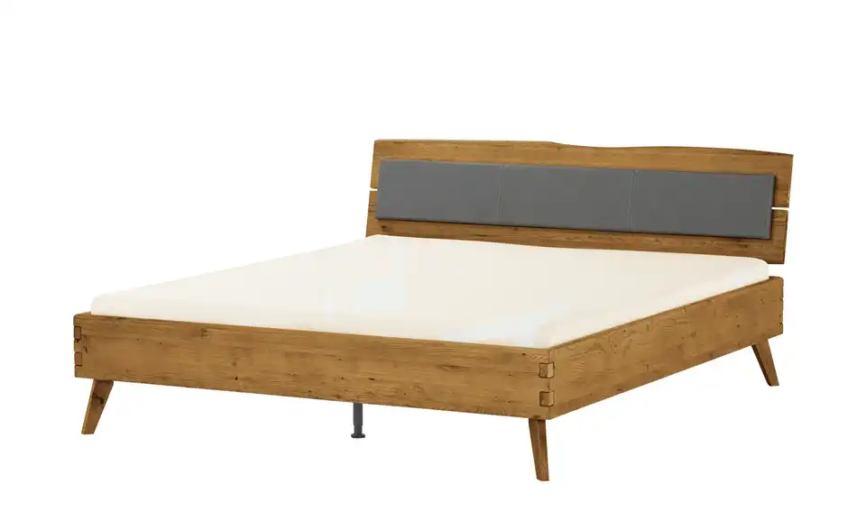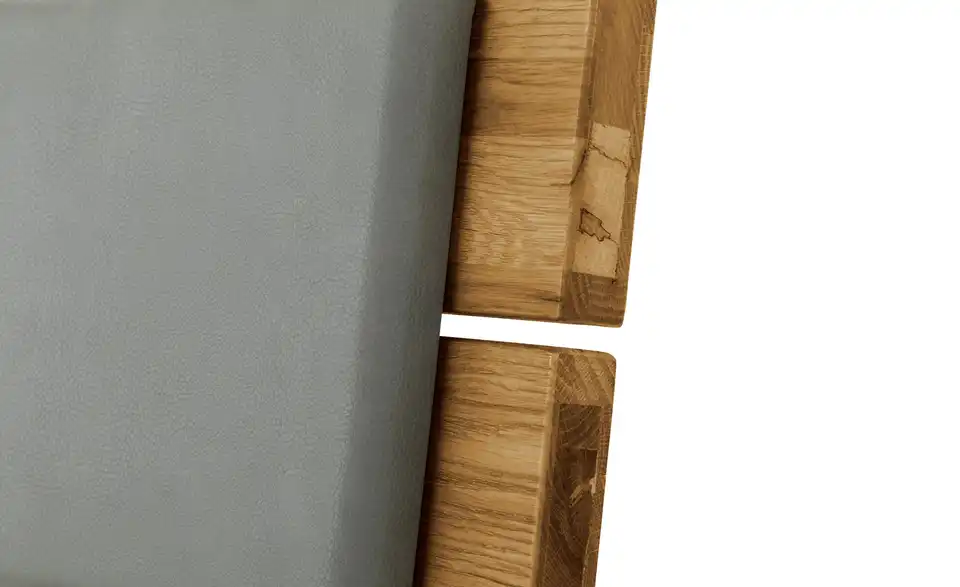 Für das Bettgestell Bivio wurde echtes Eichenmassivholz verwendet. Eine schöne Holzmaserung, Asteinschlüsse und eine attraktive Reliefoberfläche machen daher den Charakter des Bettes aus. Bewusst gesetzte Highlights an den Bettecken und die schräg zulaufenden Füße betonen das natürliche Design. Auch die Baumkante am Kopfteil setzt Akzente. Kontrast und moderner Eyecatcher ist das graue Kopfteilpolster. Dezente Ziernähte unterteilen hier den pflegeleichten Kunstlederbezug in drei Bereiche. Hier können Sie sich anlehnen und den Abend entspannt ausklingen lassen. Das Massivholz-Bettgestell Bivio ist mit handelsüblichen Lattenrosten kombinierbar und kann mit Ihren vorhandenen Matratzen ergänzt werden. Dank der vierfach verstellbaren Einlegetiefe bestimmen Sie, wie Sie am besten schlafen.