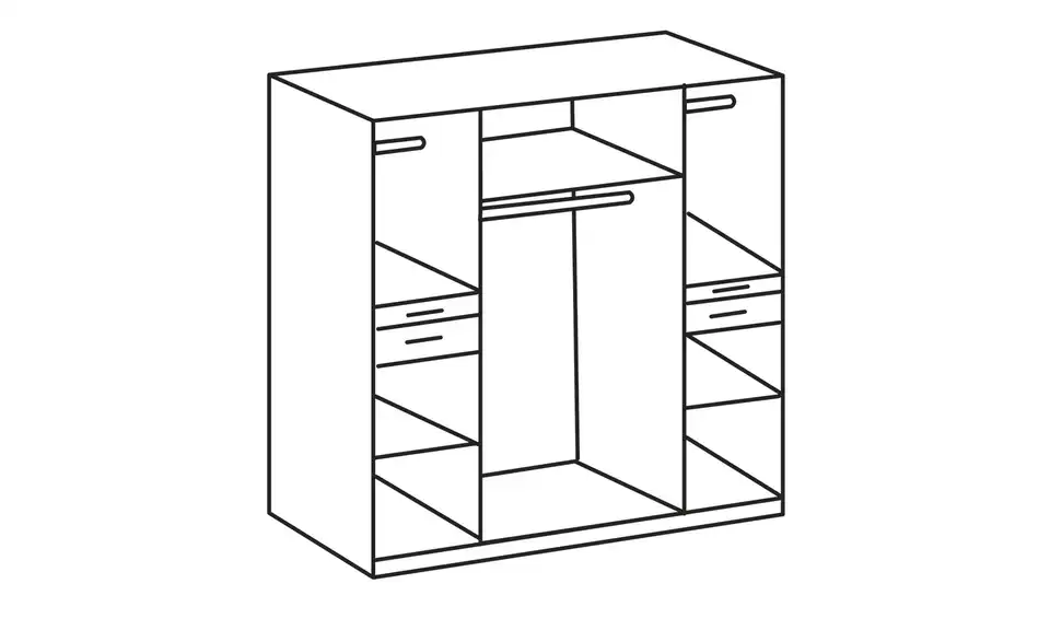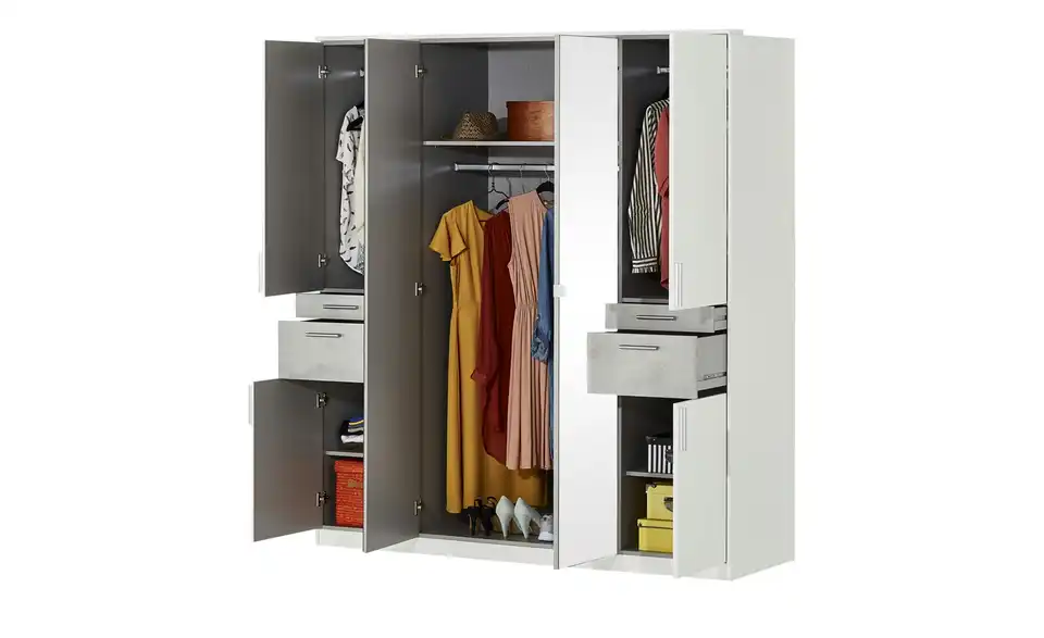 Bei einem Kleiderschrank kommt es nicht nur auf die Größe, sondern vor allem auf die Einteilung an. Deshalb empfiehlt sich der Kleiderschrank Stafford. Er verfügt über sechs Türen und vier Schubkästen. Im Schrankinneren stehen Ihnen fünf Fächer und drei Kleiderstangen zur Verfügung. Eine praktische Schubladenunterteilung ist im Lieferumfang enthalten. Sie können sie wahlweise links oder rechts einsetzen. Dank der Unterteilung macht sich die Schublade gut für Krawatten oder andere Accessoires. Stafford ist in Weiß und Betonoptik designt. Mittig gibt es zwei Spiegeltüren.