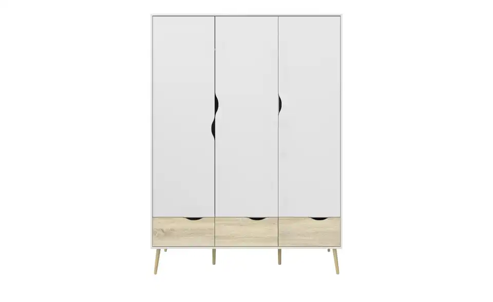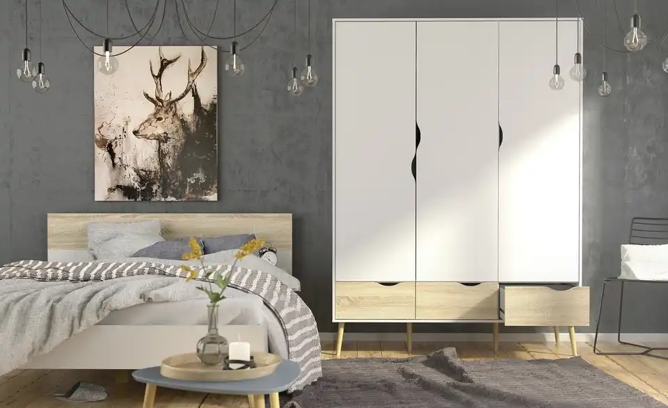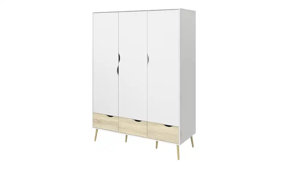 Die Serie Oslo Easy bringt skandinavisch-frische Leichtigkeit in das Schlafzimmer. Die weißen Flächen werden durch Akzente in Eichenoptik abgesetzt. Teil der Serie ist dieser praktische Kleiderschrank. Er verfügt über drei Drehtüren im oberen Bereich, sowie drei Schubladen unten. Insgesamt können Sie die Kleidung in fünf Fächern und an einer Kleiderstange hängend verstauen. Zwei der vier Einlegeböden sind höhenverstellbar, um die Größe der Schrankfächer anzupassen. Die Oberflächen sind foliert und deshalb wenig kratzeranfällig und sehr leicht zu pflegen.