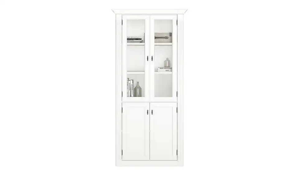 Die Vitrine der Serie Petit Chalet überzeugt mit liebevollen Details und ihrem charmanten Landhausstil. Die Zierstrukturen befinden sich am Kranz, den Fronten und in Form eines Facettenschliffs an den Glastüren. Nutzen Sie zwei blickdichte Fächer und drei einsehbare Fächer für Deko, Bücher und Mehr. Entscheiden Sie selbst, ob Sie Holzböden oder Glasböden hinter den beiden Vitrinentüren bevorzugen. Gut zu wissen: Dank zeitgemäßer Soft-Close-Funktion schließen die Türen besonders leise.