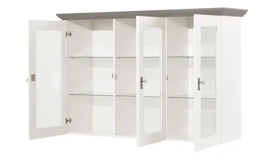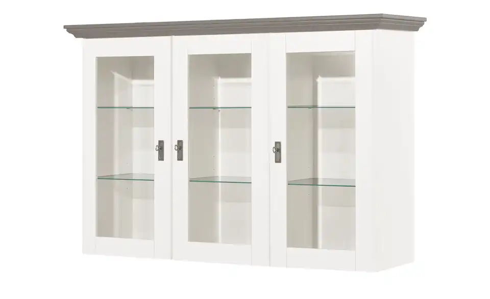 Vitrinen sind gleich doppelt praktisch. Sie bieten Stauraum – und zeitgleich können Sie darin Ihr Geschirr oder Porzellan in Szene setzen. Der Vitrinenaufsatz Florian von maison bleue ist eine Ergänzung für das gleichnamige Sideboard. Er wird einfach auf das Sideboard gesetzt. Der Aufsatz im Landhausstil verfügt über drei Türen mit Glaseinsatz. Für einen freien Blick in die Fächer dahinter. Innen können Sie gleich neun Vitrinenfächer nutzen. Florian besteht aus massiver Kiefer und ist weiß gebeizt und lackiert. Der Kranz setzt sich farblich ab.