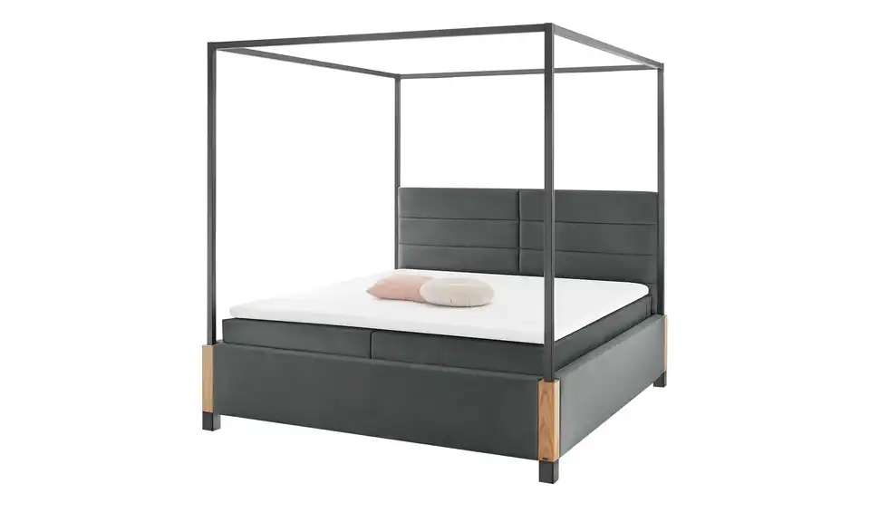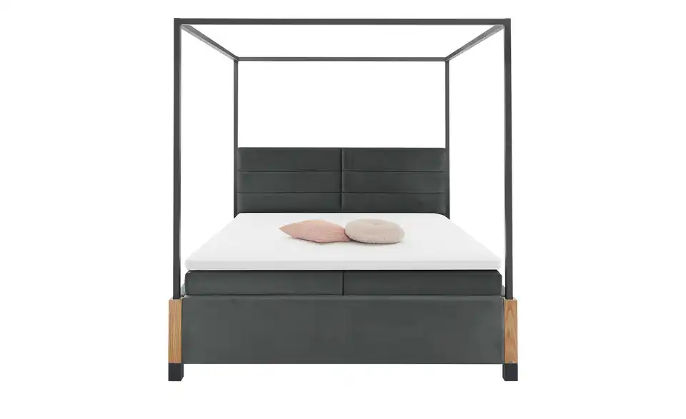 Schon seit 1993 erfüllen Möbel der Marke GALLERY M höchste Qualitätsansprüche und begeistern mit luxuriösen Komforteigenschaften. Die Marke verwendet eine klare Designsprache und achtet auf die Nutzung hochwertigster Materialien. Diese werden mit viel Liebe zum Detail und mit handwerklicher Perfektion zu einem Markenmöbel gefertigt, das so individuell ist, wie Sie selbst. Maßgeschneiderter Komfort und individualisierbares Design: Das Himmelbett My Heaven lässt sich kinderleicht an Ihre Schlafgewohnheiten und Ihren Einrichtungsstil anpassen. Moderner Blickfang ist das Kopfteil mit seiner Kassettensteppung. Durch die acht symmetrisch angeordneten Polsterbereiche wird der Stil des Bettes gekonnt eingefangen. Der samtig weiche Bezug schafft dabei eine ausbalancierte Mischung aus Komfort und Optik. Wählen Sie aus einer von vier modernen Bezugsfarben und entscheiden Sie sich für eine passende Gestellausführung. Hier haben Sie die Wahl zwischen einem glänzenden, verchromten Metallgestell und einer edlen, anthrazitfarbenen Ausführung. Kombinieren Sie dazu eigene, luftige Schals und Betthimmel, um ein exklusives Ambiente zu erschaffen. Natürliche Highlights aus Massivholz komplettieren das Designkonzept und lassen eine natürliche Note einfließen. Ob helles Eichenholz oder dunkles Nussbaumholz: Sie entscheiden, was zu Ihrem Einrichtungsstil am besten passt. Für höchsten Komfort sorgt die Kombination aus verstellbaren Federholzrahmen und Matratzen mit Tonnentaschenfederkernen. Letztere können Sie je nach gewünschtem Liegeempfinden aussuchen: So bleiben keine Wünsche offen.