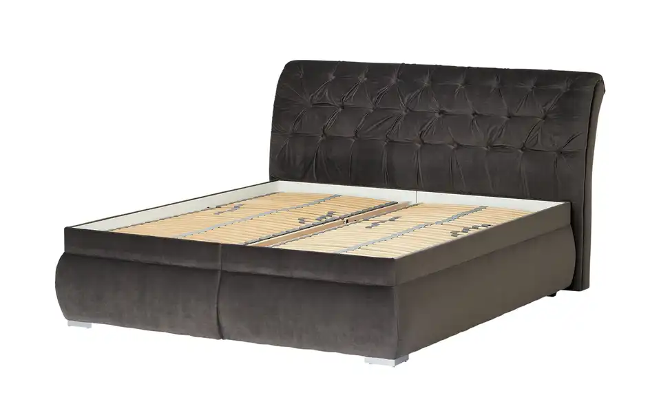 Elegant, dekorativ und mit einem royalen Touch zeigt sich das Polsterbett Derby. Hingucker und Markenzeichen zugleich ist das mit Zierknöpfen versehene, komfortabel gepolsterte Kopfteil. Hier können Sie sich bequem anlehnen und zum Beispiel ein gutes Buch genießen. Das gesamte Bett ist mit einem pflegeleichten, strapazierfähigem Polyesterbezug bezogen. Rechteckige Metallfüße veredeln das elegante Erscheinungsbild von Derby gekonnt. Für höchsten Schlafkomfort ist selbstverständlich gesorgt. Die beiden mitgelieferten Lattenroste besitzen je 28 bewegliche Leisten, sodass er sich individuell an Ihre Liegebedürfnisse anpassen lässt. Kopf- und Fußteil lassen sich außerdem separat voneinander hochklappen und geben dann den innenliegenden Bettkasten frei. Verstauen Sie hier Wechselbettwäsche oder Gästebettzeug: Platz gibt es genug.