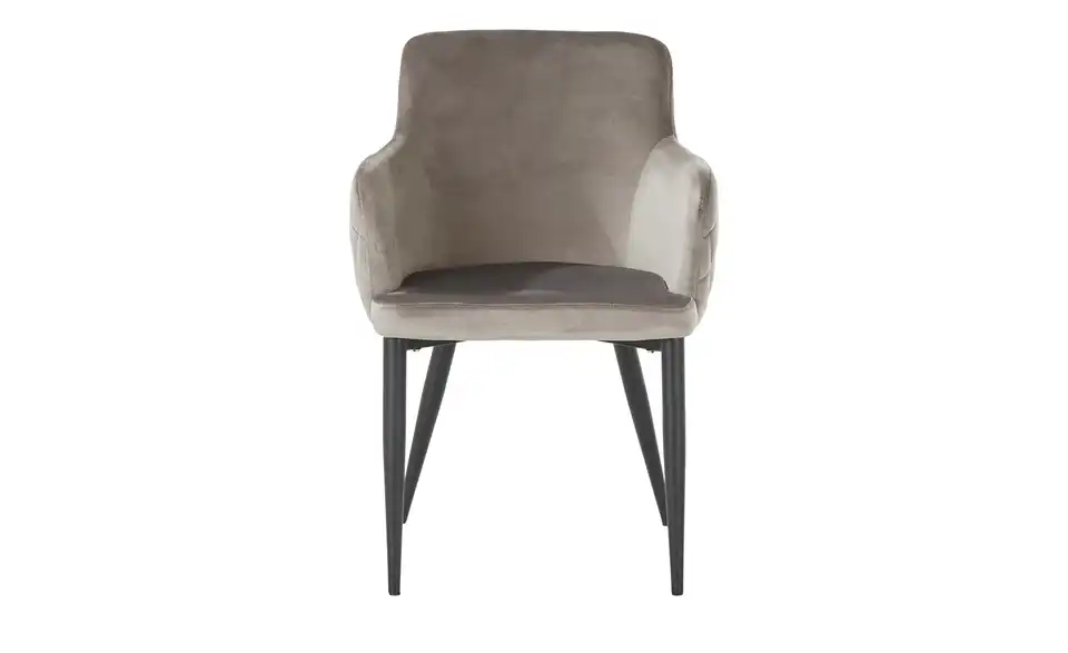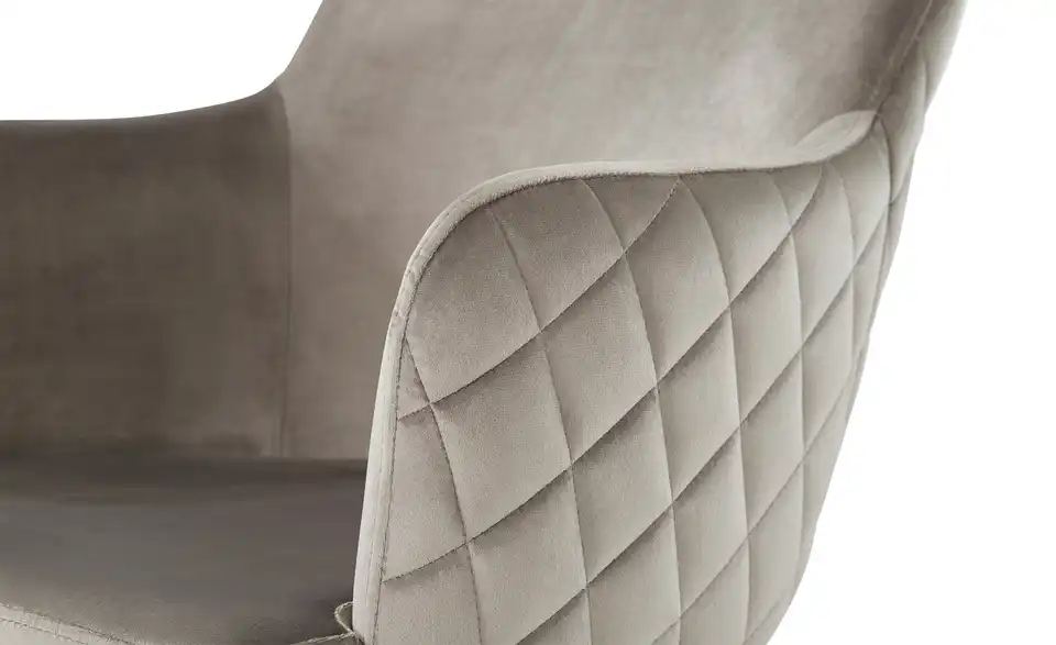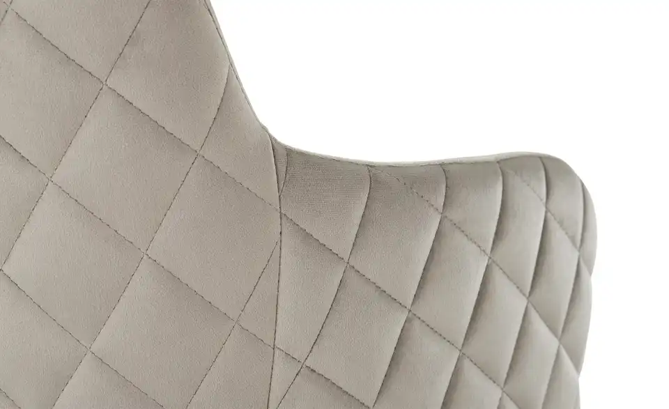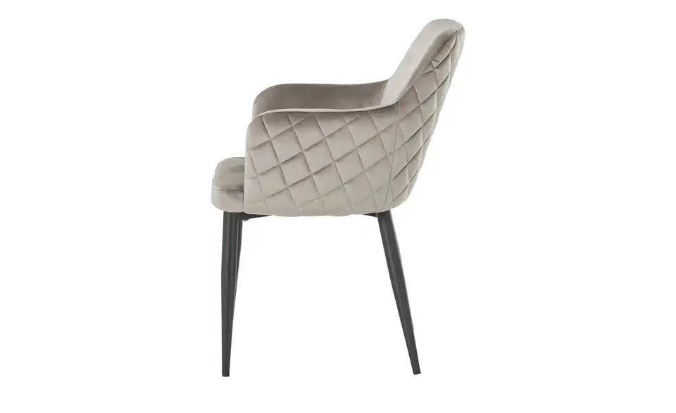 Ein edler Eyecatcher ist der Armlehnenstuhl Heiner. Sein schimmernder Bezug aus samtig weichem Polyester besitzt an der Außenseite eine dekorative Diamant-Steppung. Für den nötigen Sitzkomfort sorgt die hochwertige Schaumstoffpolsterung. Die mattschwarzen Metallfüße sind leicht gespreizt und gewährleisten einen festen Stand. Ob als Einzelstück oder als Sitzgruppe: Der Armlehnenstuhl Heiner fügt sich in nahezu jedes Raumkonzept problemlos ein.