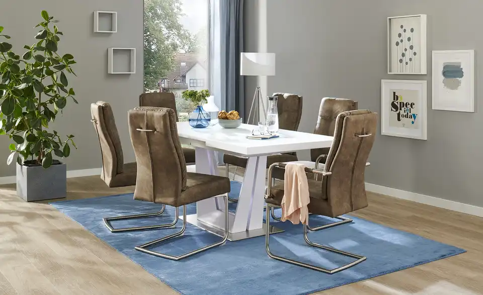 Der Freischwinger Bertie bietet Ihnen alle Vorteile und Qualitäten, welche man sich von einem Sitzmöbel wünschen kann. Der Stuhl ist mit einer Polsterung ausgestattet. Der Bezug aus Mikrofaser verleiht der braunen Sitz- und Rückenfläche ein angenehmes Sitzgefühl. Der Stuhl lädt aufgrund der Polsterung aus Schaumstoff zum Relaxen ein. Das Modell Bertie besitzt eine Gesamtbreite von 45 cm, eine Höhe von 100 cm sowie eine Tiefe von 65 cm. Werten Sie Ihr Zuhause mit diesem Stuhl geschmackvoll auf.