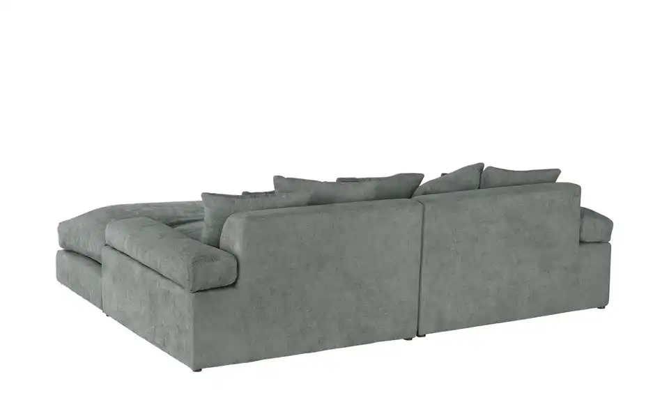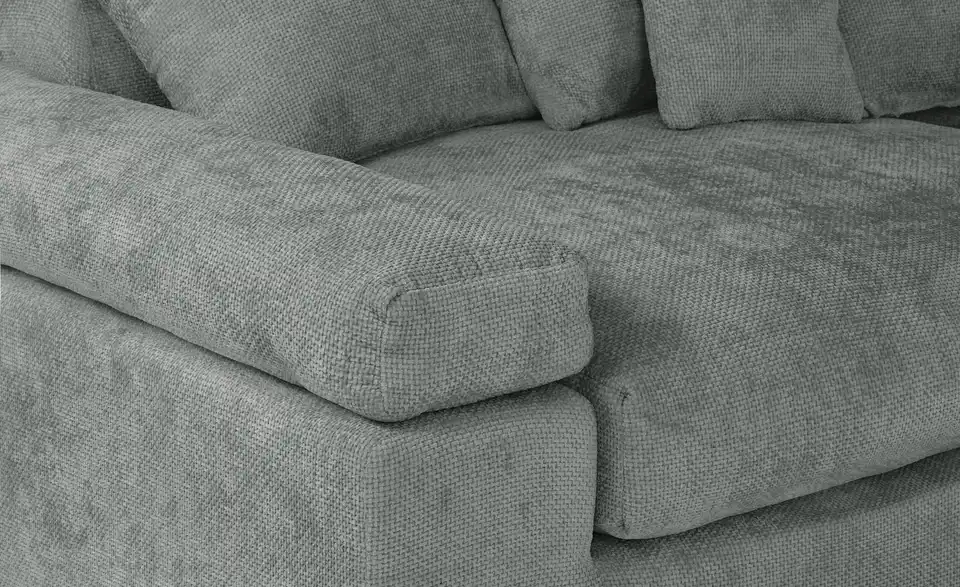 Dieses Ecksofa lädt mit seinen dicken Polsterkissen zum Entspannen ein. Sieben Zierkissen, zwei breite Armlehnen und eine extra große Ottomane sorgen für ein Plus an Gemütlichkeit. Machen Sie es sich bequem und fügen Sie eigene Dekodecken und -Kissen hinzu. Der einfarbige Bezug ist kombinationsfreudig und sogar auf der Rückseite des Sofas zu finden. So können Sie das Ecksofa auch mittig im Raum oder von der Wand abgerückt platzieren. Entscheiden Sie sich nur noch für Ihre Lieblingsfarbe und wählen Sie zwischen trendigem Cord und kuschelweichem Chenille-Stoff.
