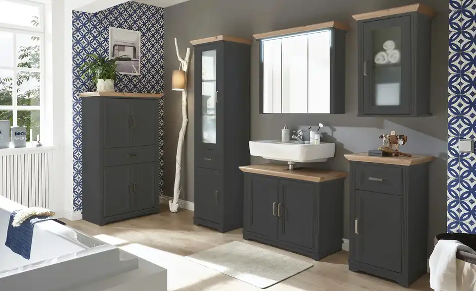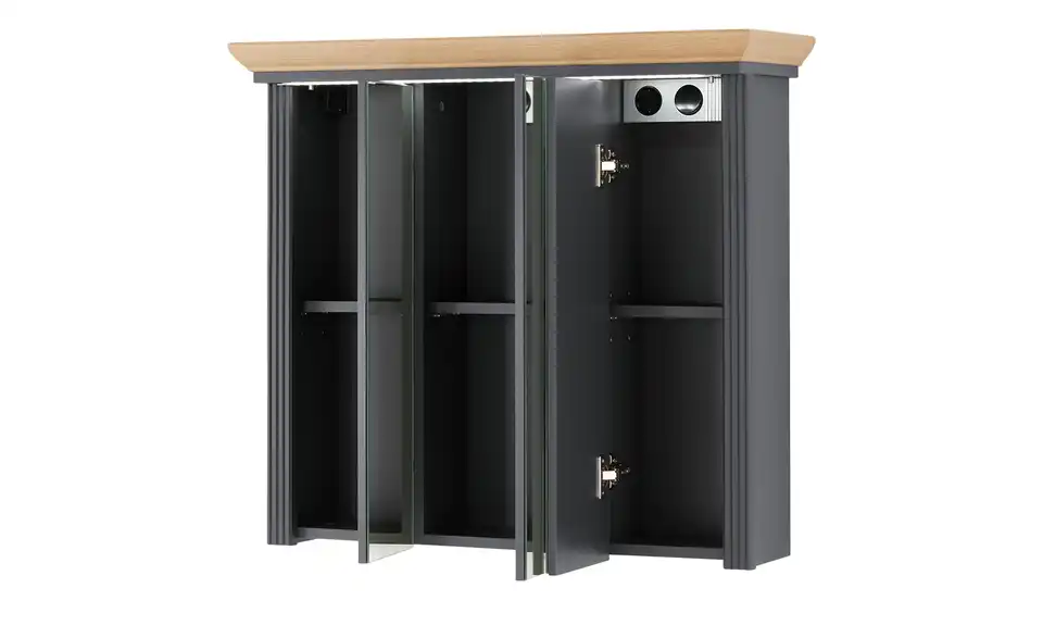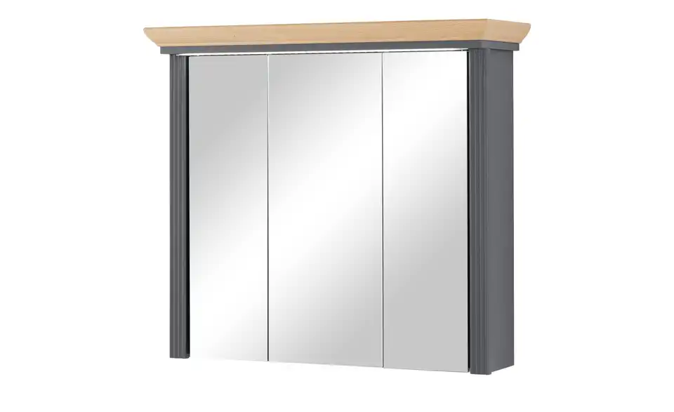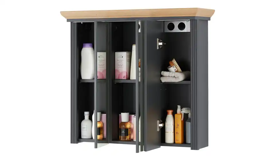 Dieser Spiegelschrank bringt den attraktiven Landhausstil in Ihr Bad. Liebevolle Details und die Abdeckplatte aus authentischer Asteichen-Nachbildung betonen den Look gekonnt. Verstauen Sie Badzubehör und Kosmetik ganz einfach hinter den drei Spiegeltüren. Die mitgelieferte Kranzbeleuchtung sorgt für passendes Licht während der Morgenroutine.