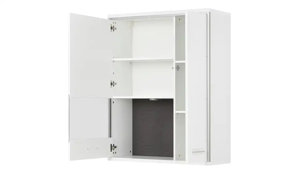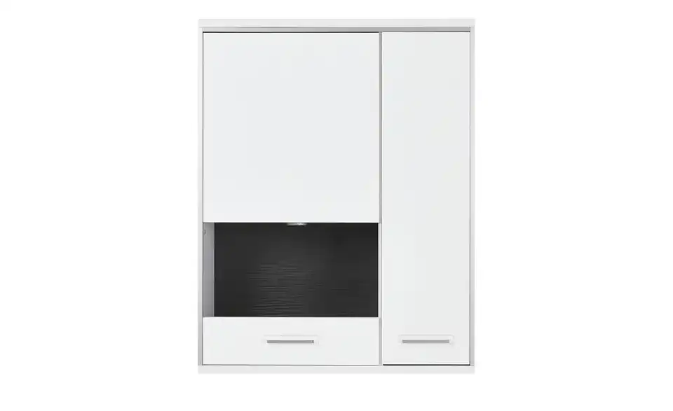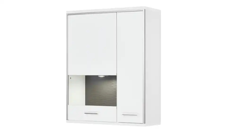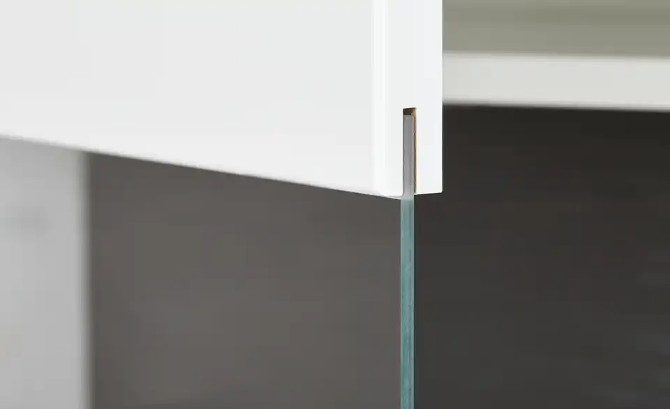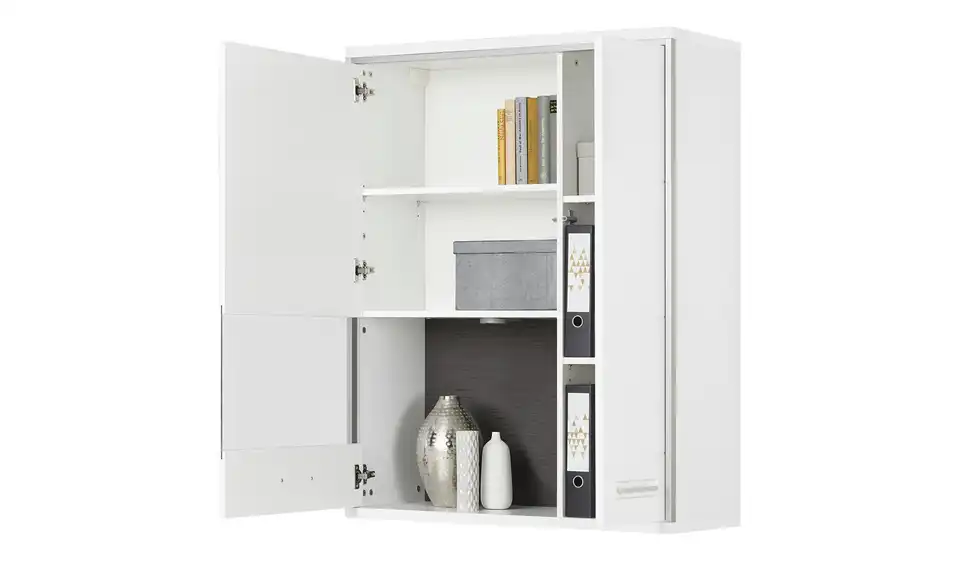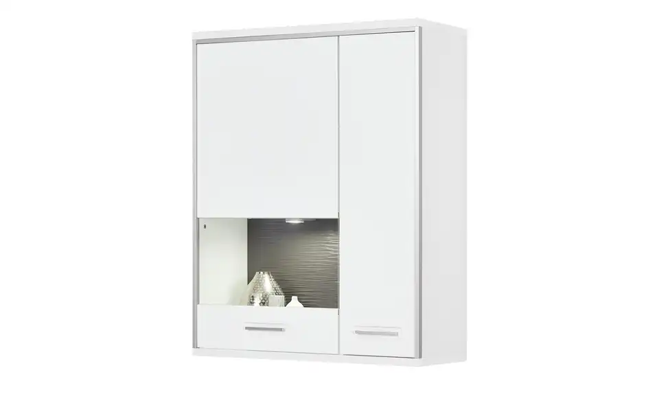 Wie der Name schon verrät, wird das Hängeelement Setto einfach an die Wand angebracht. Dort bietet es Ihnen viel Stauraum. Dank der beiden Türen ist der Inhalt der Fächer vor neugierigen Blicken und Staub geschützt. Drei der vier Einlegeböden sind in der Höhe variabel. Das Hängeelement verfügt über ein Vitrinenfach. Der Inhalt wird durch die graue Rückwand mit geriffelter 3D-Optik noch besser in Szene gesetzt. Der Grauton setzt sich auch schön von der weißen Farbe Settos ab.