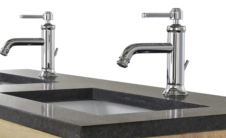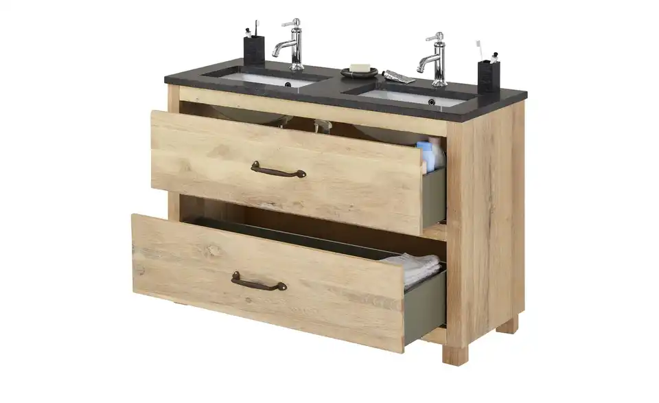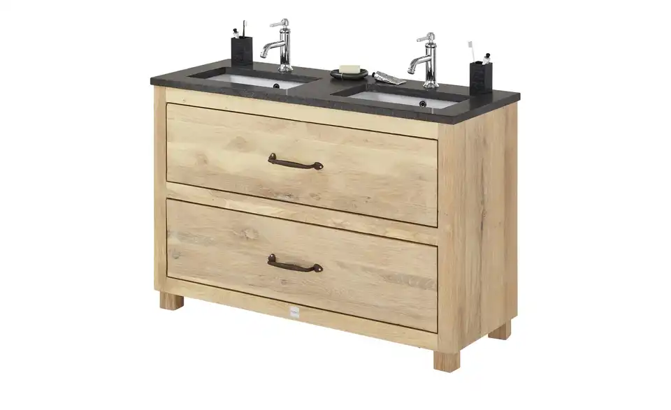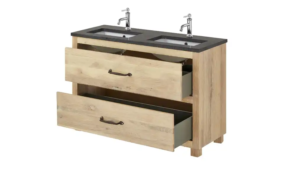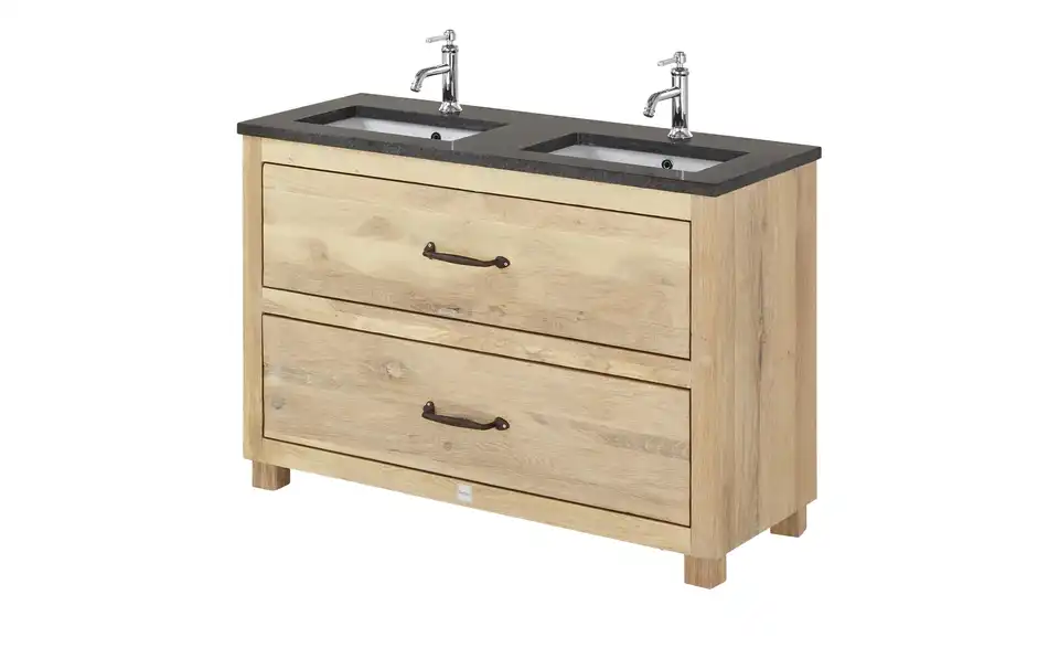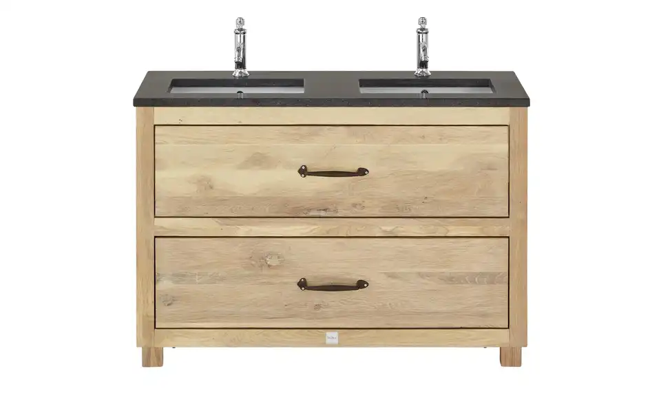 Edles Design und eine hervorragende Qualität vereinen sich bei der Waschtischkombination La Provence von VAN HECK. Der große rechteckige Waschtisch verfügt über zwei Becken, so dass er von zwei Personen gleichzeitig genutzt werden kann. Seine graue Granitoptik wird durch das Weiß der Becken abgesetzt. Der passende Waschtischunterschrank ist aus massiver Eiche gefertigt. Sie verfügt über eine schöne Maserung, die durch die geölte Oberfläche noch mehr hervorgehoben wird. Die zwei großen Schubladen erstrecken sich über die gesamte Breite des Schrankes und bieten so jede Menge Stauraum.