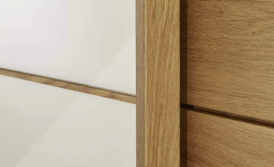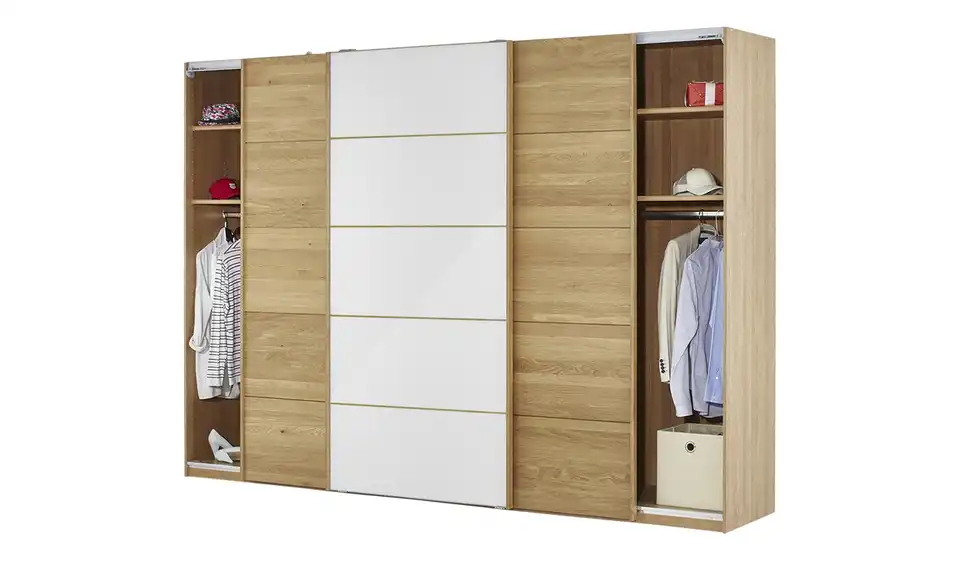 Kyran ist ein edler, hochwertig verarbeiteter Schrank der Marke Woodford. Er bietet Qualität Made in Germany und ist unter anderem mit dem Goldenen M ausgezeichnet worden. Die Front besteht aus drei Schwebetüren, die seitlich aufgleiten. Die beiden äußeren Türen sind aus massiver Eiche Natur gefertigt. Die mittlere Tür hat eine Oberfläche aus edlem Farbglas in einem eleganten hellen Cremeton. Ein schöner Kontrast zum Holz bzw. der Holzoptik des Korpus. Das Schrankinnere unterteilt sich in drei Elemente. Je Element stehen Ihnen zwei Böden und eine Kleiderstange zur Verfügung. Ideal also für Ihre Kleidung.